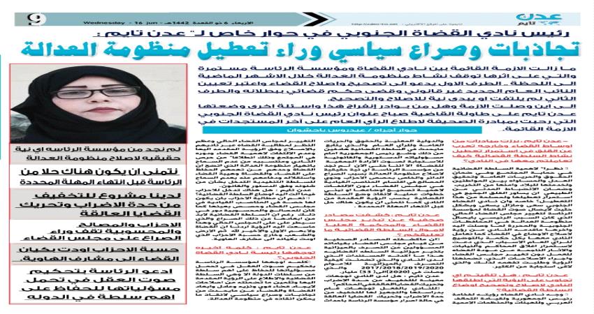 الى اين وصلت الازمة وهل من بوادر إنفراج هذا واسئلة اخرى وضعتها عدن تايم على طاولة القاضية صباح علوان رئيس نادي القضاة الجنوبي التي رحبت بمبادرة الصحيفة لاطلاع الرأي العام على آخر المستجدات في الازمة القائمة.