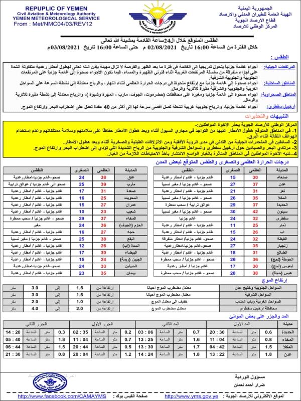 واشارت ان سحب كثيفة مصحوبة بعواصف رعدية شديدة وأمطار مابين المتوسطة والغزيزة ستشهدها المحافظات الممتدة من صعده شمالاً الى تعز.