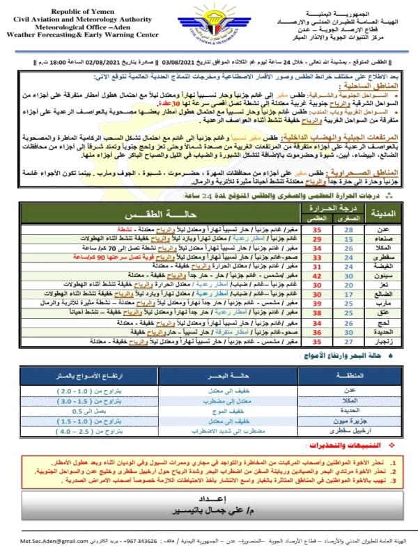 توقعت مراكز الأرصاد الجوية في اليمن، إستمرار تأثر عدد من المحافظات بهطولات متفاوتة للامطار المصحوبة بعواصف رعدية خلال الساعات القادمة ويوم غد الثلاثاء، مع اجواء صحوة الى غائمة في العاصمة عدن.