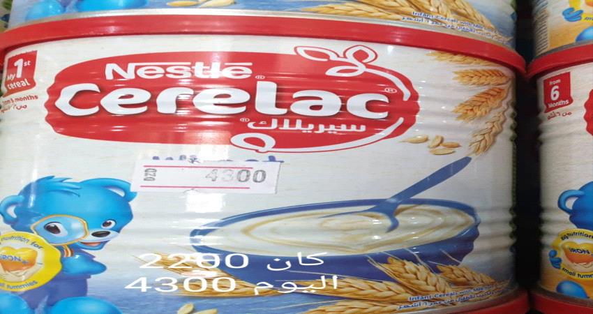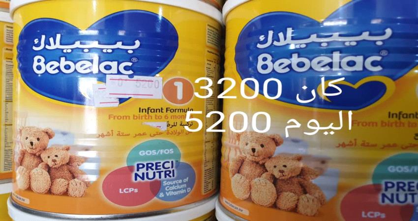 اما حليب الاطفال المجفف فقد سجل ارتفاع إلى الضعف، حيث كان سعر (حليب بيبيلاك) 3200ريال يمني، وسجل اليوم سعر 5200ريال، وكذلك (حليب السيريلاك) والذي كان سعره 2200ريال يمني، فقد ارتفع اليوم إلى 4300ريال يمني.