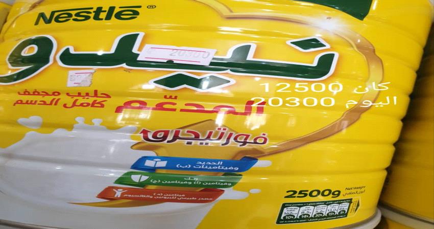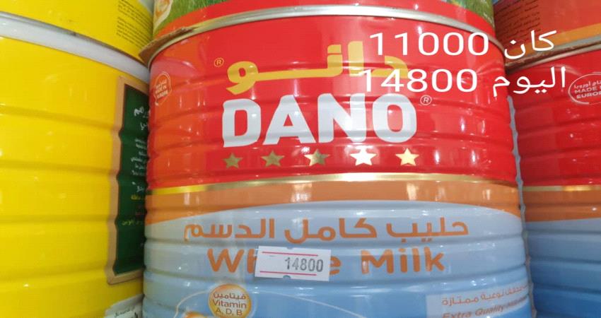 وحسب التسعيرة الجديدة وصل سعر (حليب الدانو)، إلى 14800ريال يمني، فيما كان سعره السابق 11000ريال يمني، ووصل سعر (حليب النيدو) حجم(2500g) إلى 20300ريال يمني، فيما كان سعره السابق 12500ريال يمني.