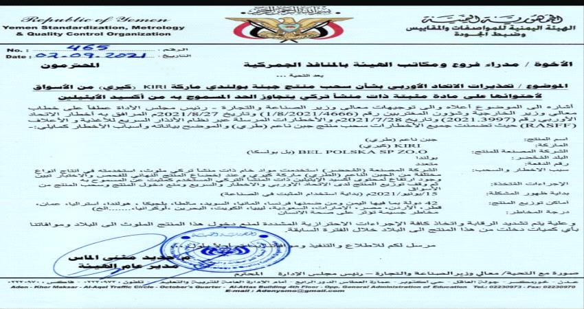 وأصدرت الهيئة امس خطابا لمورد المنتج في اليمن قضى بسحب كافة كميات المنتج الداخلة الى البلاد والتي تم تصنيعها ابتداء من منتصف يونيو 2021م وما بعد.