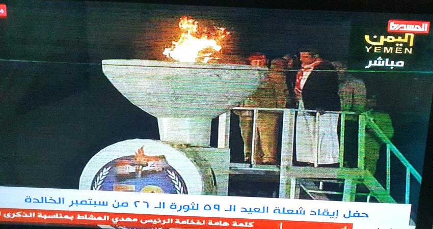 في المكان نفسه والمنصة نفسها والشعلة ذاتها أوقد رجال ورموز وطنية على مدى 53 عاما واليوم تبدو الصورة وفي المكان والزمان يستبق الحوثيون الشرعية وجيشها الوطني في إحياء المناسبة المختطفة منذ 21 سبتمبر 2014م