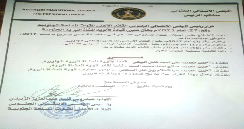 وجاء نص، القرار رقم "27" لعام 2021م، بشأن تعيين قيادة لألوية المشاة البرية الجنوبية.
