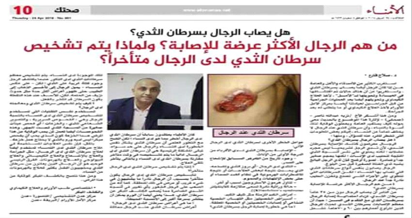 في إطار التوعية بسرطان الثدي بشهر اكتوبر نتناول استغراب الكثير من الاصدقاء والاهل والعامة عن اذا كان الرجل ايضا يصاب بسرطان الثدي وأن هناك حالات تم اكتشافها في العيادة وتحويلها لمركز الامل لاخذ العلاج الكيماوي او وتحويلهم ايضا بعد العمليات الجراحيه من قبل الجراحين لعيادتنا ايضا بركز الامل للاورام لاخذ العلاج الكيماوي او مايتطلب له بعد الجراحة..ومن هذا اشكر المرحوم نزيه عبدالله ناصر (صحفي بالامناء) الذي أثار هذا الموضوع بالحديث معي حوله في وقت سابق بكيف يستفيد العامة ويعملوا الوقاية لذلك اسوة بالنساء وان سرطان الثدي عند الرجال لا يختلف تمام بالنساء وعليه اليكم بعض المعلومات التي تخطر للفرد عنه للسؤال ومنها :