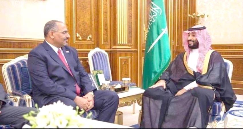 وأثنى رئيس المجلس الانتقالي على دعم المملكة في مواجهة الحوثيين قبل دخولهم عدن مع انطلاقة عاصفة الحزم. وقال: «كان دعما سعوديا 100%، خاصةً في محافظة الضالع، عبر الإنزال الجوي للأسلحة والذخائر، حتى تم تحرير الضالع، ليتم العمل في عدن مع قطبي التحالف العربي ممثلاً بالمملكة والإمارات».
