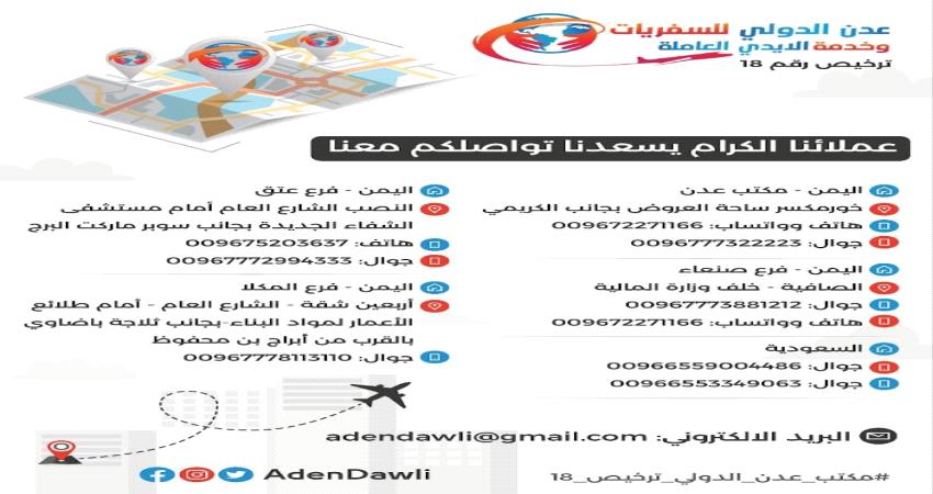 مكتب عدن الدولي للسفريات والسياحة وخدمة الايدي العامله ترخيص رقم 18