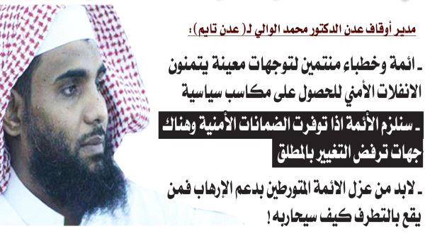 ويبرر الوالي تخوف البعض من الائمة بالخشية من الاستهداف الشخصي مشيرا الى انه في حالة توفير الضمانات الامنية فهنا باستطاعنا تحميلهم المسئولية .