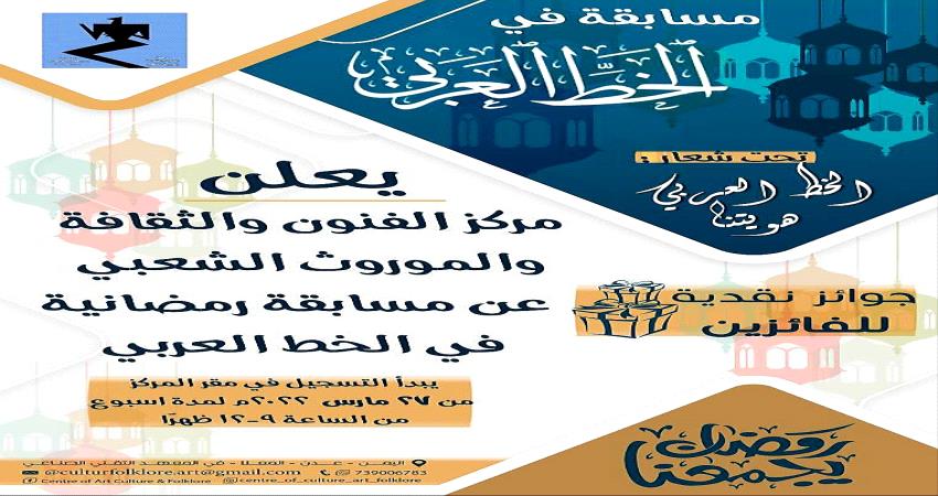تتواصل هذه الأيام في مركز الفنون والثقافة والمورث الشعبي بمحافظة "عدن"، أعمال تسجيل الراغبين من المشاركين من مختلف الفئات العمرية، في المسابقة الرمضانية، في مجال "الخط العربي"، التي ينظمها المركز تحت شعار : "الخط العربي هويتنا" .