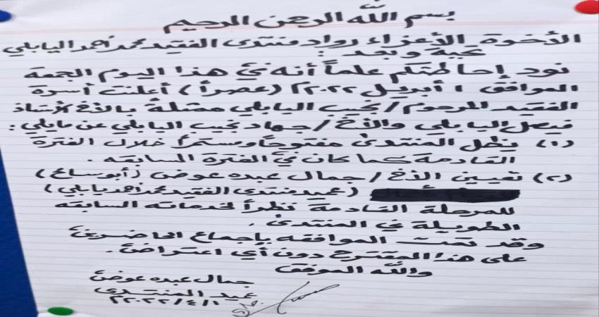 ثانيٱ : تعيين الاخ جمال عبده عوض * ابو سامح * عميدٱ لمنتدى الفقيد محمد احمد اليابلي الثقافي الاهلي خلفٱ للفقيد الراحل نجيب يابلي في المرحلة القادمة نظرٱ لخدماتة السابقة والطويلة في المنتدى .