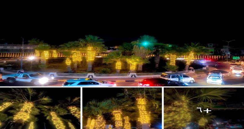 جولة ادارة الأمن بخورمكسر في العاصمة عدن كما بدت الليلة بعد استكمال أعمال التزيين لٱشجار النخيل فيها.