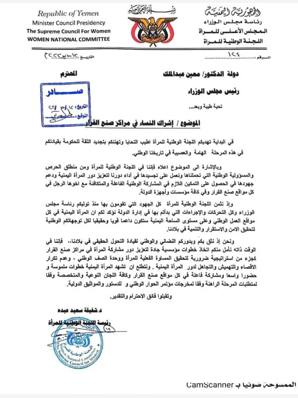 بعثت الدكتورة شفيقة سعيد عبده رئيسة اللجنة الوطنية للمرأة ، بمذكرات رسمية لكل من رئيس مجلس القيادة الرئاسي اللواء الدكتور رشاد العليمي، و لدولة رئيس مجلس الوزراء الدكتور معين عبدالملك ، تؤكد فيه على ضرورة إشراك النساء في مراكز صنع القرار وكافة اللجان النوعية والمتخصصة وفقا لمتطلبات المرحلة الراهنة ، ولمخرجات الحوار الوطني والدستور والمواثيق الدولية .