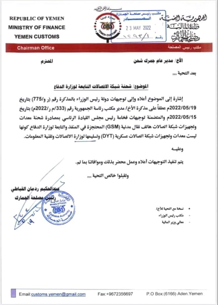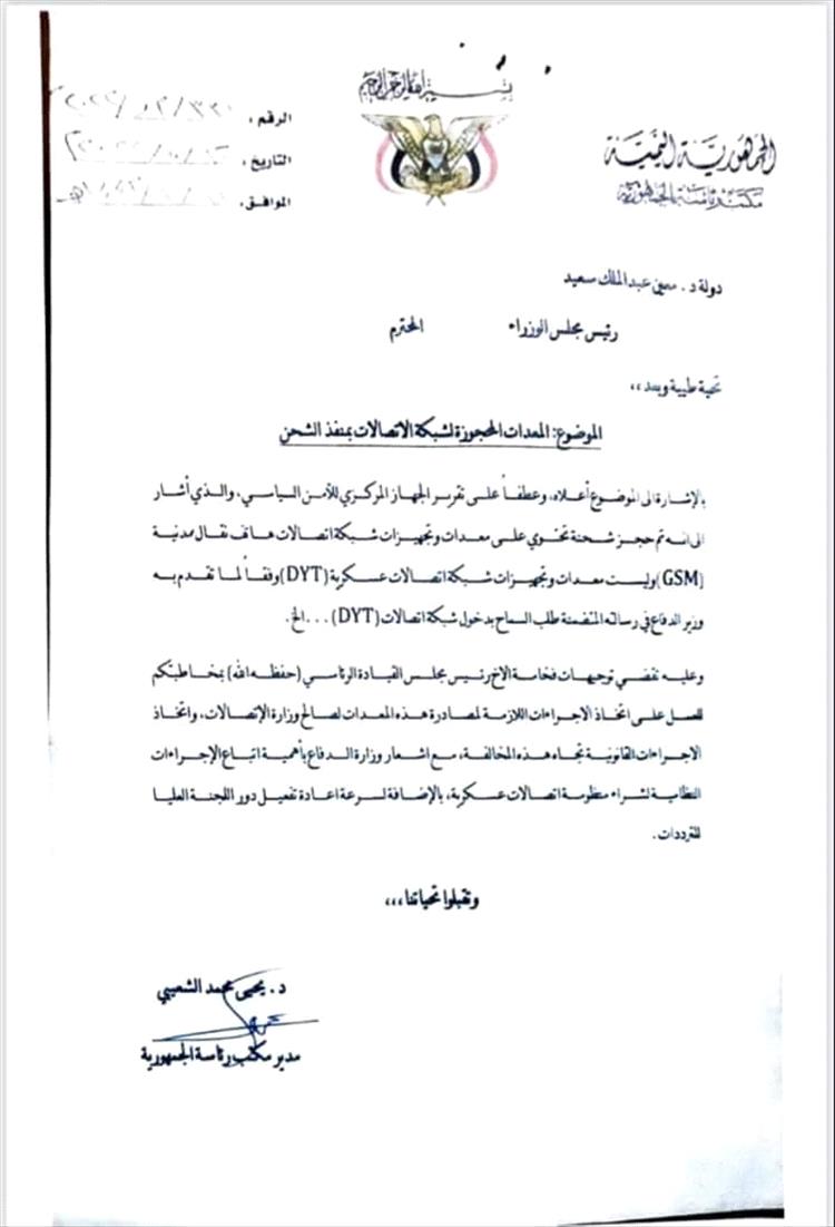وحسب الوثائق فقد طالبت جميعها وبناء على توجيه رئيس مجلس القيادة الرئاسي الدكتور رشاد العليمي، بمصادرة تلك الشحنة من الأجهزة لصالح وزارة الاتصالات وتقنية المعلومات.