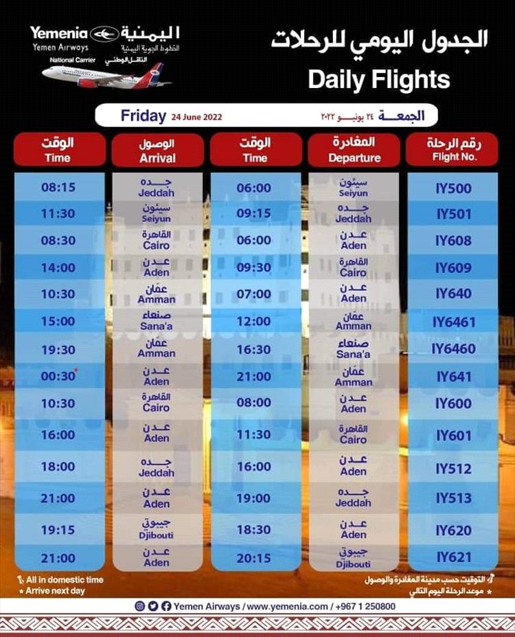 جدول مواعيد اقلاع رحلات طيران اليمنية ليوم غد الجمعة كالتالي: