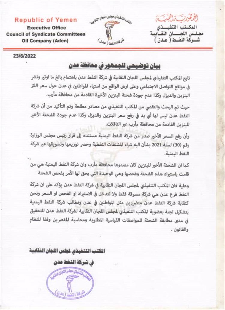 وعلية فان المكتب التنفيذي لمجلس اللجان النقابية في شركة النفط عدن يؤكد على ان شركة النفط فرع عدن هي شركة مسوقة فقط ولا تتدخل في الاستيراد او الفحص او السعر ونحن كنقابة شركة النفط عدن متضررين مثل المواطنين في عدن ونطالب شركة النفط اليمنية بتشكيل لجنة بعضوية المكتب التنفيذي لمجلس اللجان النقابية لشركة النفط عدن للتحقيق في مدى مطابقة الشحنة للمواصفات القياسية المطلوبة ومحاسبة المقصرين وفقا للنظام والقانون .