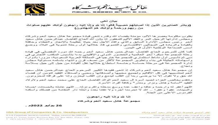 إن مجموعة هائل سعيد أنعم وشركاه إذ تنعى فقيدها الكبير المرحوم عبدالرحمن هائل سعيد أنعم لمنتسبيها في كل الأقاليم ولجميع محبيها وأصدقائها ومحبي وأصدقاء الفقيد لتؤمن أن قضاء الله حق ولا تقول إلا ما يرضي ربنا إن القلب ليدمع وإن القلب ليحزن وإنا على فراقه لمحزونون.