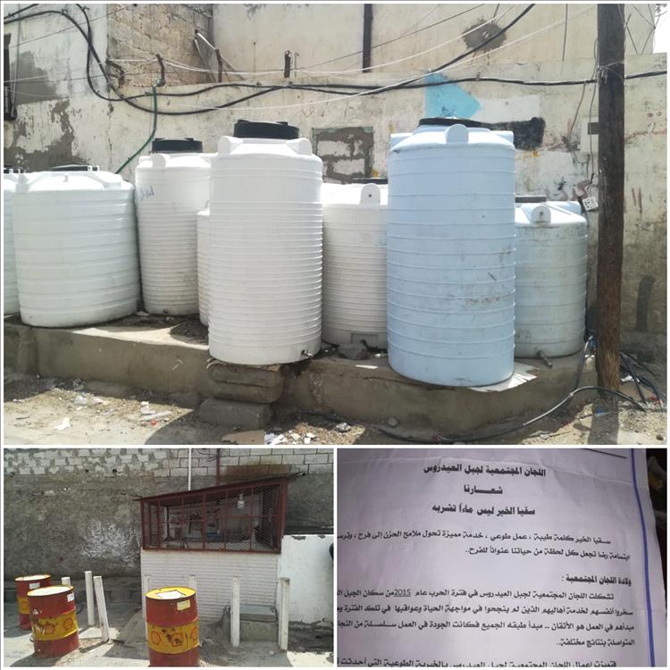 العمل الطوعي والسعادة وجهان لعملة واحدة فكانت الولادة لتشكيل اللجان المجتمعية في منطقة جبل العيدروس في فترة الحرب 2015م في زمن صعب لا يقبل على الأرض غير الرجال فقط فكانت الأعمال طواعية والخير الذي تفعله في الصباح سوف ينساه الناس غالبآ في المساء لكن أهالي جبل العيدروس لم تنس ماقدمته لجانها المجتمعية في توفير المياه شريان الحياة بعد حرمان وفقدان المياه سنوات حيث استطاعت اللجان المجتمعية في جبل العيدروس من توفير 3 مضخات ماء قوة 15خيل وتوفير 3 دينمات قوة 5 خيل وتجهيز عدد 3 دينمات ماء قوة خيل واقامة 4 خزانات ماء سعة 3000 لتر وعمال 3 في عمل طوعي لتشغيل الدينمات.