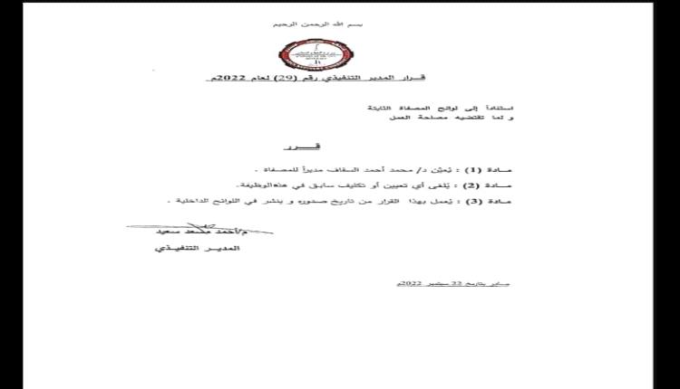 اصدر المدير التنفيذي لشركة مصافي عدن احمد مسعد سعيد قرارا بتعيين مديرا للمصفاة.