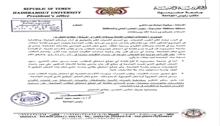 وبعث رئيس الجامعة أ.د.محمد سعيد خنبش خطابا رسميا للمحافظ مبخوت مبارك بن ماضي قال فيه :" اننا في جامعة حضرموت لا نقر اقامة اي تجمع احتفالي للطلاب تحت مسمى حفل التخرج سوى الحفل المركزي الذي تقيمه الجامعة مطلع كل عام بقاعة ا.د. علي هود باعباد".