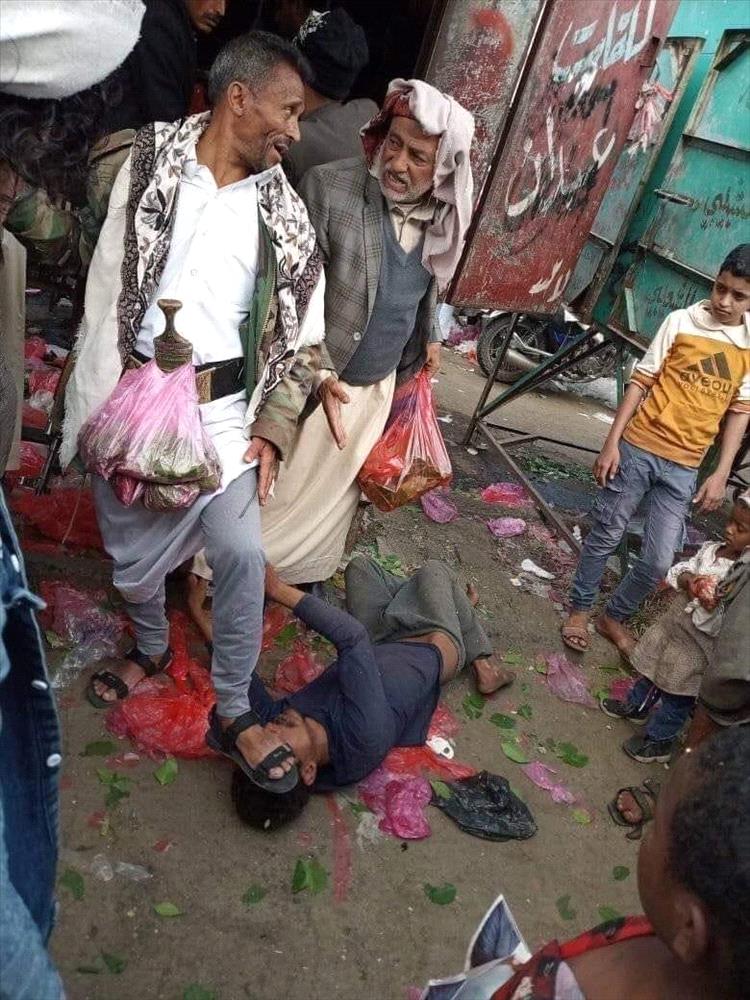 في صورة من سوق القات بالظهار في محافظة إب اليمنية الجمعة أظهرت واحدة من العبث والفعل الحقير للإنسان في مناطق سيطرة الحوثي واثارت ردود وانتقادات واسعة للوضع الانساني الذي بلغ حد الدعس.