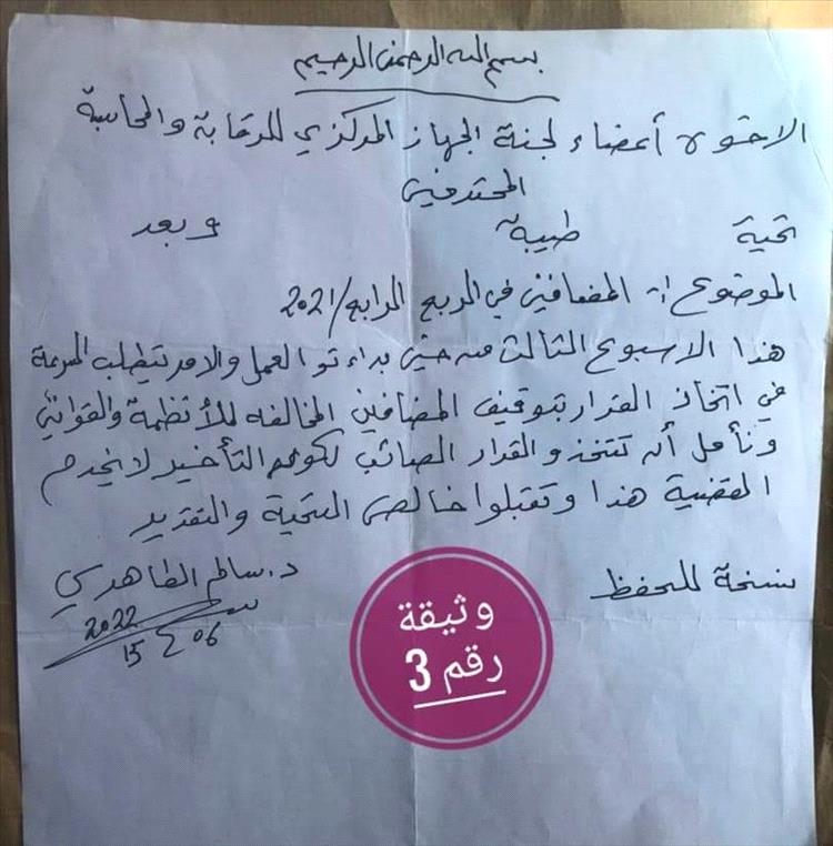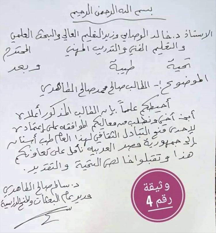 ففي الوقت الذي كان المذكور يبعث برسائله الى الجهاز المركزي للرقابة والمحاسبة (وثيقة رقم 3) كان يضغط على قيادة الوزارة للحصول على منحة دراسية لأحد أقاربه (وثيقة رقم 4).