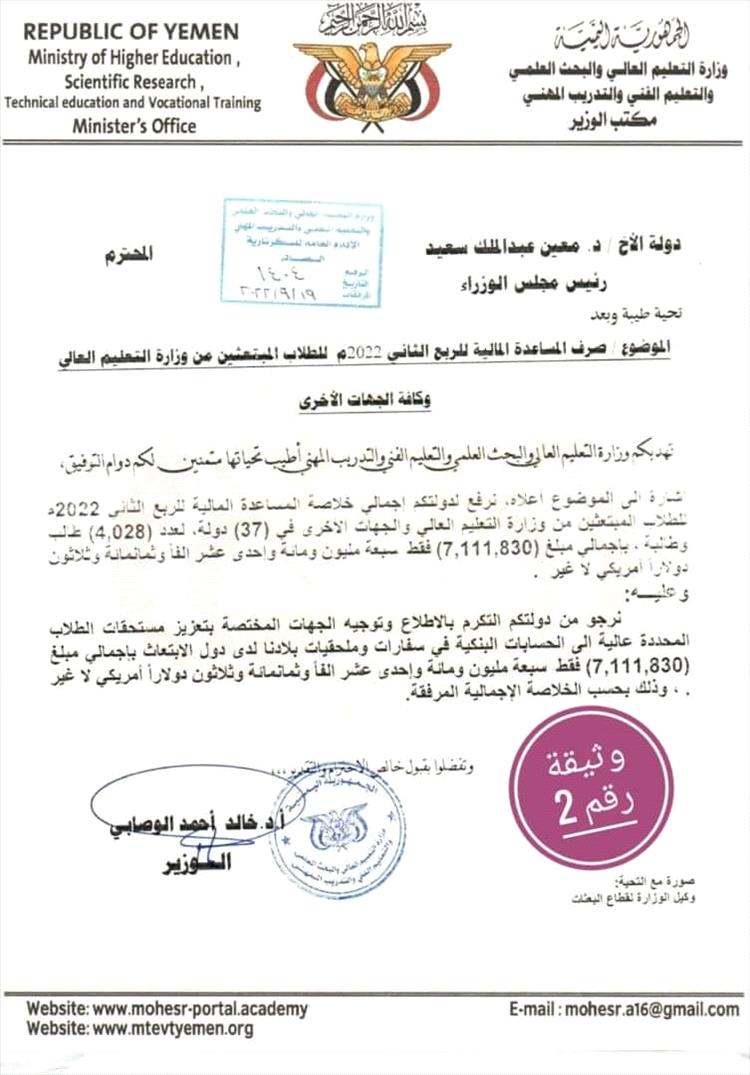 مع التأكيد على أن جميع الملفات المعتمدة للمساعدات المالية تتم وفق الإجراءات الإدارية المعتمدة في الوزارة منذ العام 2017 ولا يتم إدراج اي طالب إلى كشف المساعدة المالية إلا بعد صدور قرار إيفاد من الوزارة، كما تم التوجيه على كافة الملفات من قبل مدير عام البعثات السابق وبتحويل خطي منه، ولكن بعد رفض اعتماد ملفات خاصة للمذكور، بدأ بشن حملات التشوية ضد القطاع والوزارة بشكل عام.
