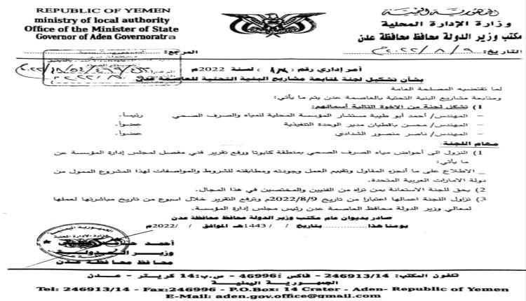 اطالب محافظ العاصمة عدن باعلان نتيجة تقرير اللجنة الذي شكلها مرفق القرار ضمن المنشور و اتخاذ الاجراءات القانونية اللازمة الكفيلة بحفظ المال العام".