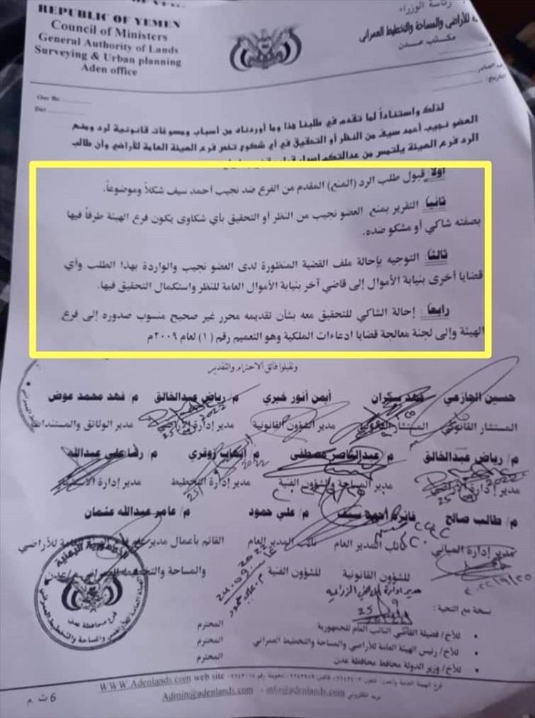 وعامر عبدالله عثمان القائم بأعمال فرع الهيئة بعدن ووجدنا ان الشكوى تتكلم بلسان القضاء والسلطة القضائية دون أي صفة لها في ذلك ويبدو ان الاخوه في هيئة الأراضي يخلطون بين اراضي جمعية السلطة القضائية والقضاء كمؤسسة من مؤسسات الدولة وسلطة حكم واتهام وأن القضاء يستطيع زجر كل من يجروا على عرقلة احكامة او اهانتة او التدخل بشأن من شؤؤنه وليس بحاجة لمثل الهيئة العامة للأراضي ان تتصدر مشهد الدفاع عنه إذ ان ذلك الاهانه للقضاء بابشع صورها لكن كما أشرت لمعاليكم ان الهيئة العامة للأراضي لديها مرض الحول الذي يفقدها التمييز بين الأمور ويتداخل عليها في احايين كثيرة التفريق بين سلطتها في صرف الأراضي وسلطة السيطرة على الجهه المصروف لها والتدخل بشؤؤنها كاراضي جمعية السلطة القضائية وماجرى فيها من تعد على اراضي المنطقة الحرة ومطارها لصرفها من قبل هيئة الأراضي خلافا للقانون .