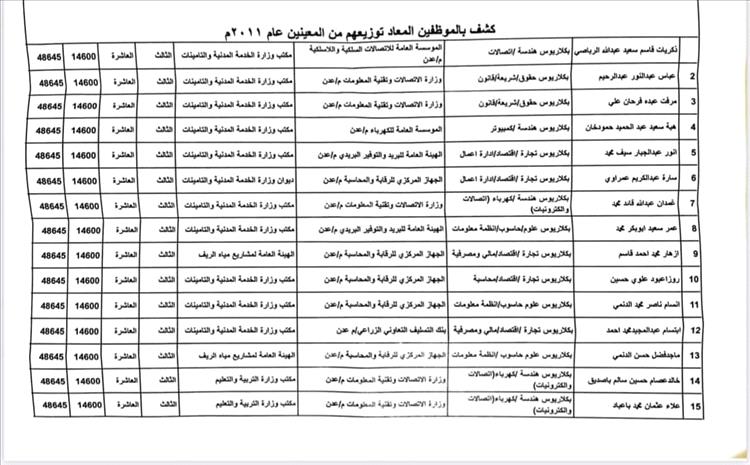 دعت وزارة الخدمة المدنية والتأمينات - عـدن الموظفين بكشف المعاد توزيعهم من المعينين عام 2011م الحضور الي وزارة الخدمة المدنية يوم الخميس والاحد الموافق 2022/11/24م 2022/11/27م.