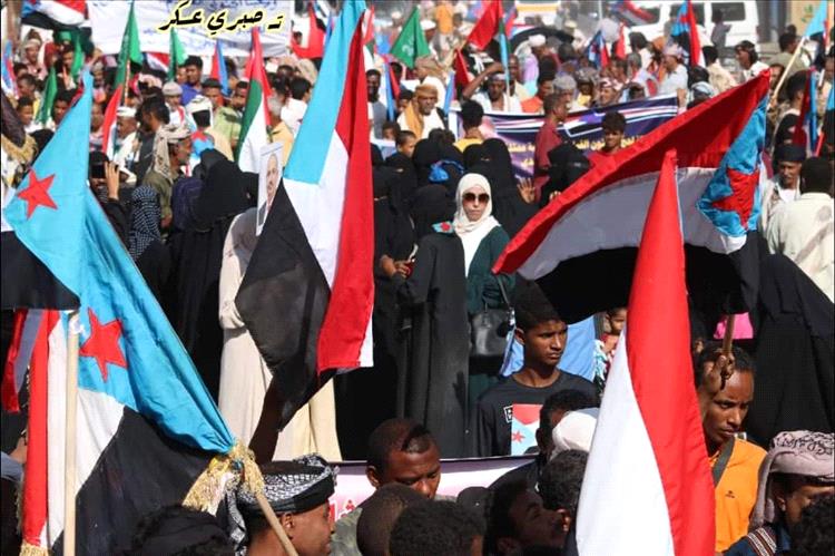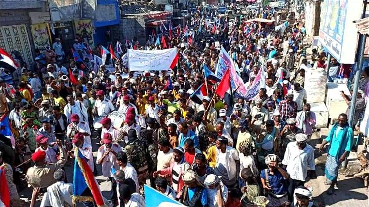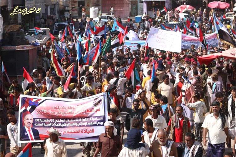 وتعالت أصوات المشاركون في التظاهرة التي تقدمها قيادات المجلس الانتقالي بالمحافظة وأعضاء الجمعية الوطنية وعدد من القيادات الأمنية والعسكرية ورؤساء الهيئات التنفيذية بمديريات المحافظة بالهتافات المطالبة بمنح الجنوب استقلاله وفض شراكته مع الجمهورية العربية اليمنية بالإضافات إلى الهتافات المجددة للعهد بالسير خلف المجلس الانتقالي الجنوبي وقيادته الحكيمة ممثلة بالرئيس عيدروس الزبيدي .