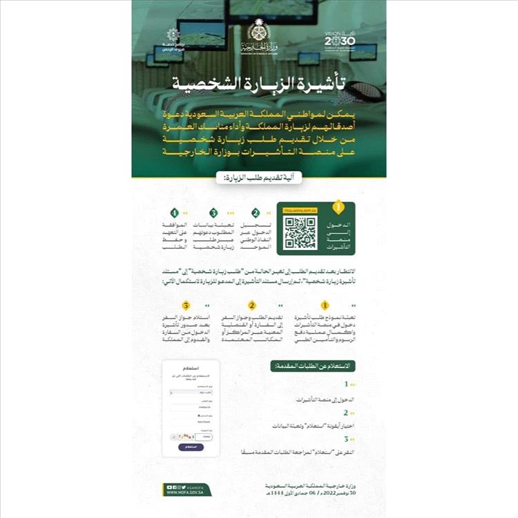 أعلنت وزارة الخارجية عن آلية الحصول على تأشيرة "الزيارة الشخصية"، التي تمكن الزوار من الدخول إلى المملكة لزيارة أصدقائهم من المواطنين، مع إمكانية التنقل بين مناطق المملكة، وتأدية العمرة والزيارة في مكة المكرمة والمدينة المنورة وزيارة المواقع الدينية والتاريخية، وحضور الفعاليات الثقافية.