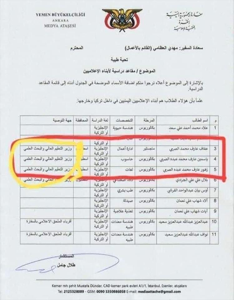 تصدر أبناء المذيع في قناة المهرية عارف الصرمي في قوائم منح البعثات الدراسية الذي فاح من خلالها فساد وزارة التعليم العالي والبحث العلمي.