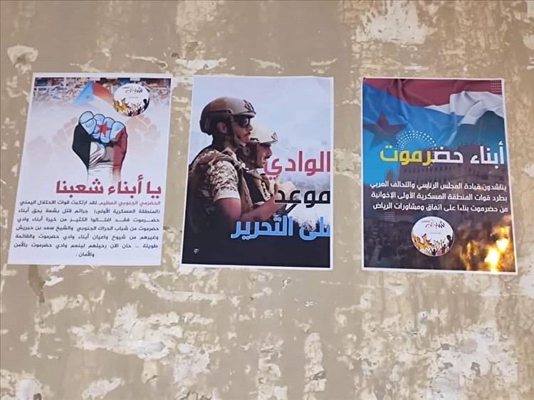 وقد كتب على الحيطان شعارات وعبارات مثل : "إخراج قوات المنطقة العسكرية الأولى مطلبنا، والانتقالي يمثلنا، وتحرير الوادي مطلبنا، وبرع من حضرموت يا ابوعوجاء، والعمالقة قادمون، والنخبة مطلبنا"؛ بالإضافة إلى شعارات لشكر لدولة الإمارات العربية المتحدة على دعمها لأبناء الجنوب ووقوفها ومساندتها لهم في أصعب الظروف.