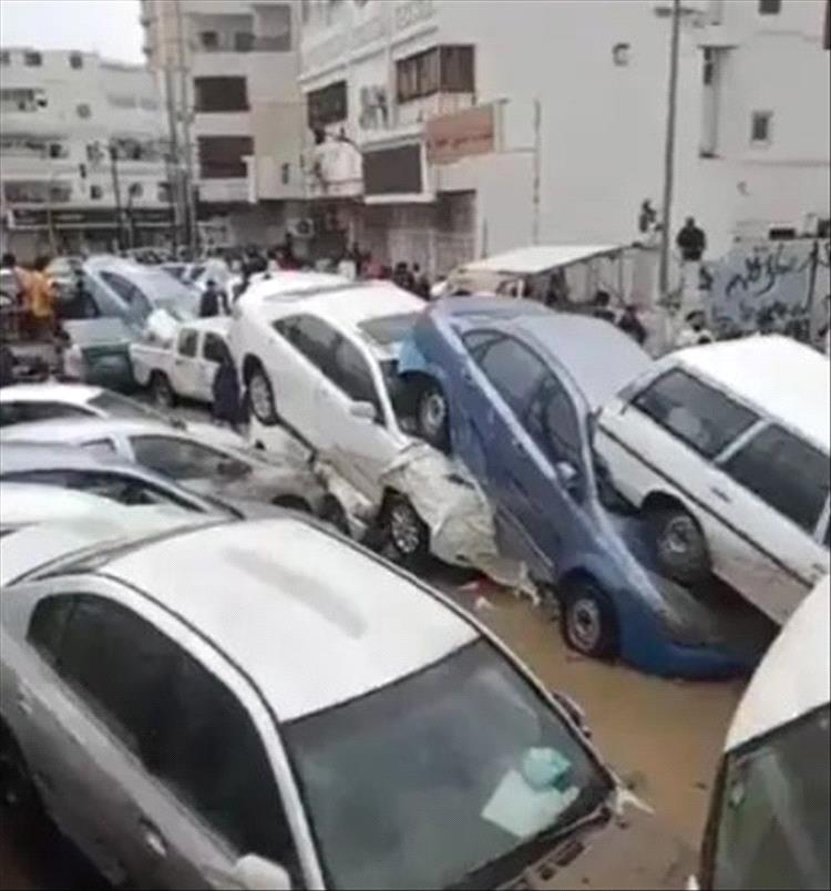 كما أظهر فيديو آخر السيارات وهي مكدسة فوق بعضها البعض بفعل السيول الجارفة.