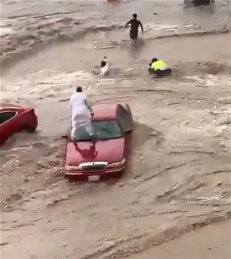وأظهر أحد المقاطع أهالي حي العتيبية وهم يقفون لا يستطيعون فعل أي شيء أمام سياراتهم التي تجرفها السيول.