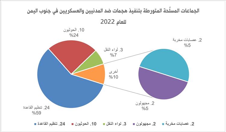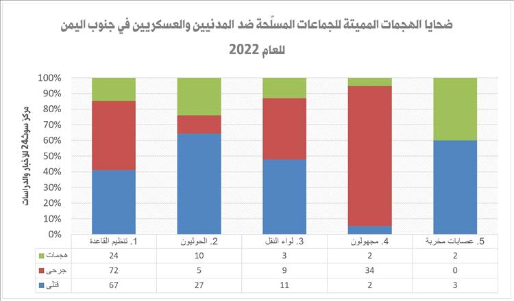 وبحسب التقرير السنوي، المكون من 100 صفحة، رصد مركز سوث24 ما يزيد عن 24 هجوما لتنظيم القاعدة في محافظات أبين وشبوة والضالع خلّفت 67 قتيلا وقرابة 72 مصابا بينهم مدنيين. فضلا عن عمليات اغتيال طالت قيادات جنوبية بارزة. كما بلغت عدد الهجمات التي قادتها جميع التنظيمات المسلّحة في الجنوب 41 هجمة، تسببت بمقتل 110 شخص من العسكريين والمدنيين وإصابة 120 آخرين. ولم تشمل هذ الإحصائية ضحايا المعارك المباشرة في جبهات الصراع العسكرية.
