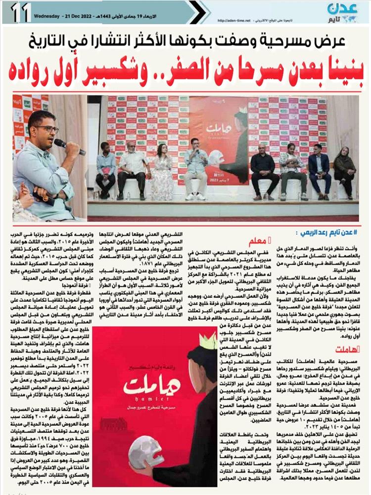 فمدينة عدن، ستشهد عرضا لمسرحية وصفت بكونها الأكثر انتشارا في التاريخ، (هاملت) من خلال تقديم ١٠ عروض حية تبدأ من ٥ -١٤ يناير ٢٠٢٣.
