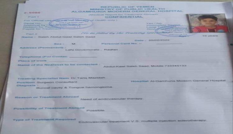 يعاني الطفل صالح عبد القوي صالح سعد ، 11 عاما ، من ردفان ، من ورم في الجانب الأيمن من اللسان والوجه. قرر الطبيب المختص إجراء عملية له ولديه تقارير طبية تؤكد ذلك ، لكن ظروف عائلته معقدة ولا يمكنهم تحمل تكاليف العملية.