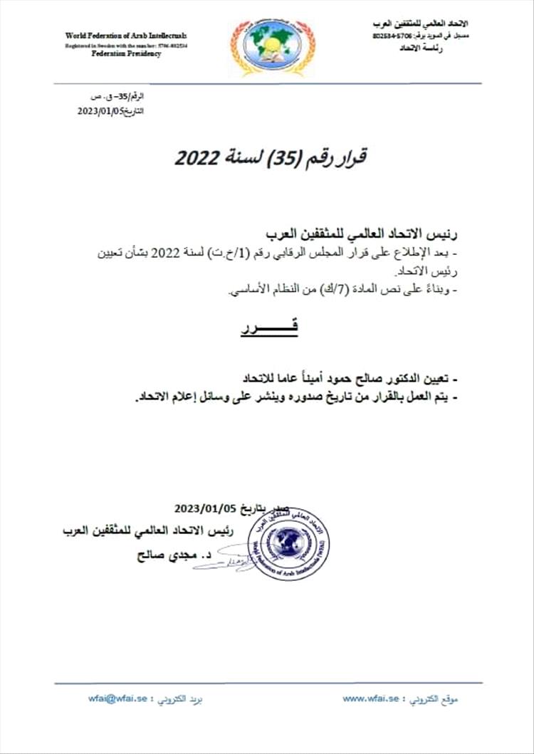 أصدر ا. د مجدي، صالح رئيس الاتحاد العالمي للمثقفين العرب ومقره السويد، قرار بتعيين الشاعر الاديب. د صالح حمود امينا عاما للاتحاد.