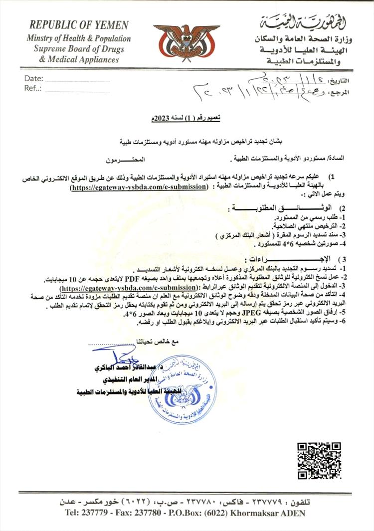 وطالب التعميم الذي تلقت وكالة الأنباء اليمنية سبأ نسخة منه جميع المستوردين لسرعة تجديد تراخيص مزاولة المهنة عن طريق استخدام الموقع الاليكتروني الخاص بالهيئه العليا للأدوية والمستلزمات الطبية بمركزها الرئيس بعدن (https://egateway_ysbda.com/e_submissiop)