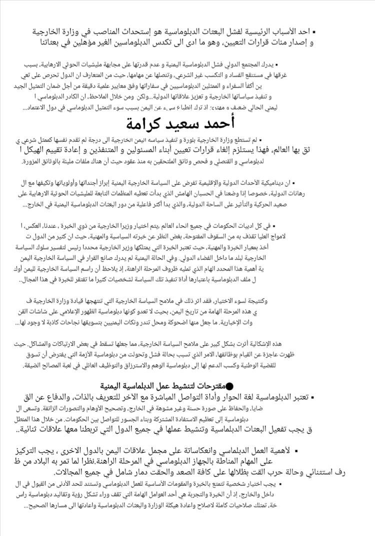 واشار التقرير الى الاسباب الرئيسة لفشل البعثات الدبلوماسية ومقترحات لتنشيط الدبلوماسية اليمنية.