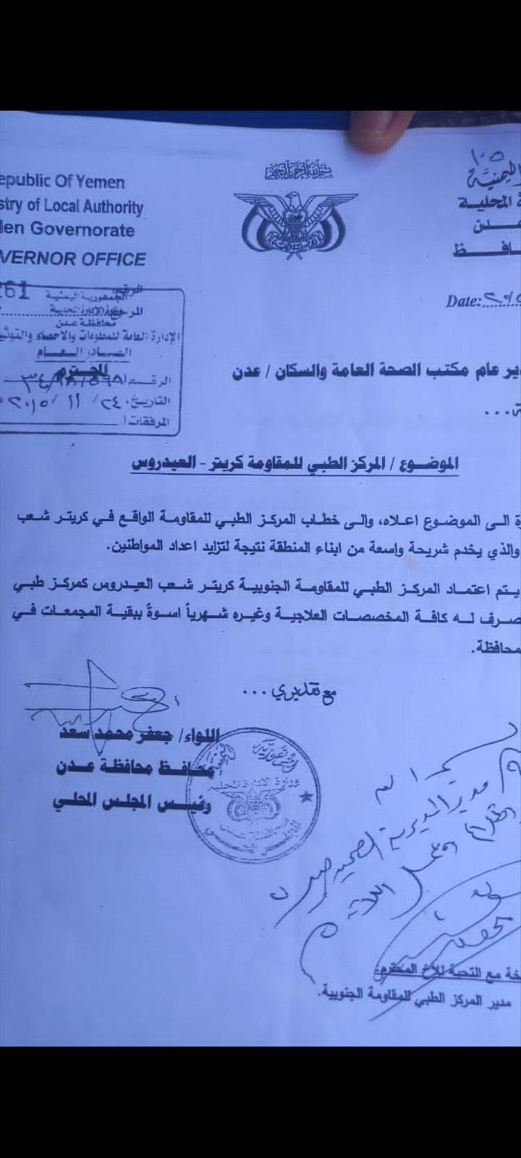 زرت المجمع الصحي بنفسي والتقيت بالاطباء والممرضين وكذا عامل المختبر وشكرتهم على مجهودهم في تخفيف معاناة اهل عدن .