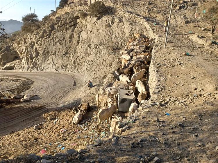 بالصور.. نفوق 12 رأسا من الثيران بإنقلاب شاحنة في طريق القبيطة بلحج