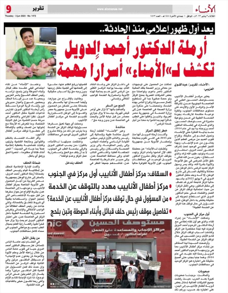 السلام عليكم ، احب اطلاعكم على أن صباح يوم غد الاربعاء سوف احضر امام وكيل نيابة الصحافة والمطبوعات في العاصمة عدن ، بسبب النشر في صحيفة "الأمناء" عن قضية مقتل الدكتور الدويل _ طيب الله ثراه _ وكان النشر بطلب من بعض ورثة الدويل !، علماً ان الشكوى المرفوع ضدي امام النيابة مرفوع من بعض ورثة الدويل ! ، كما ان الاخ رئيس التحرير عدنان الاعجم ، قد صدر بحقه امر حضور ولانه غير متواجد لن يحضر .