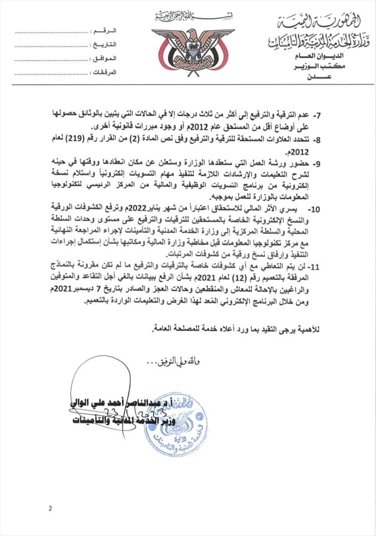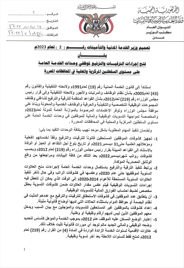 أعلن وزير الخدمة المدنية والتأمينات في تعميم رقم 2 لعام 2023م عن فتح إجراءات الترقيات والترفيع لوحدات الخدمة المدنية على مستوى السلطتين المركزية والمحلية في المحافظات المحررة.