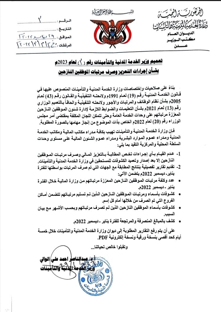 أهاب تعميم صادر من وزارة الخدمة المدنية بشأن إجراءات التعزيز وصرف مرتبات الموظفين النازحين بكافة مدراء مكاتب وزارة المالية ووزارة الخدمة المدنية ومدراء عموم الموارد البشرية ومدراء عموم الشؤون المالية على مستوى السلطة المحلية والمركزية بالتقيد بعدد من الإجراءات.