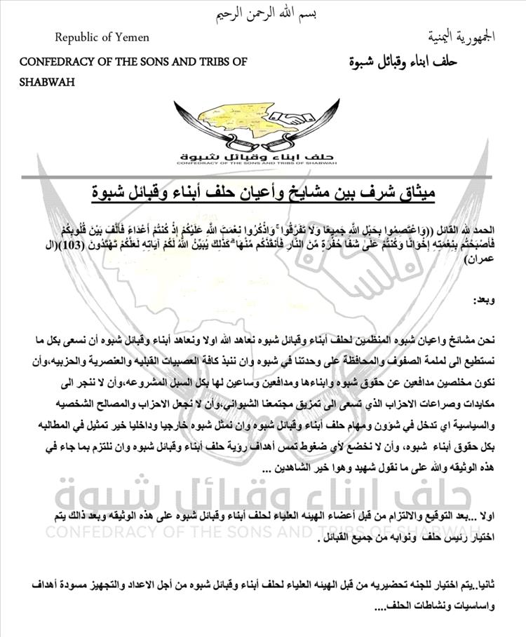 نحن شكلنا حلف قبائل شبوة لاجل شبوة وحقوق شبوة لا يعادي احد وليس ضد المجلس الانتقالي ونحن على تواصل مع المجلس الانتقالي ومع كل القوى في شبوة وحلفنا مفتوح لكل التكتلات، ونحن لنا حقوق مشروعة لشبوة لابد منها ووقوفنا مع الحق ومع شبوة والجنوب ولا نقف ضد الجنوب ولكن لنا حقوق يجب اعطانا حقوقنا المشروعة حقوق شبوة.، وعملنا تحالف قبائل شبوة لجمع ولم ابناء شبوة خاص والجنوب عام وسبب ذلك الصراعات والثاراث بين ابناء قبائل شبوة الذي حاصلة وحصلت وتسبب بها اعداء شبوة والجنوب، ونحن نسعى إلى خلق صلح قبلي بين كل قبائل شبوة ومن ثم الجنوب واذا كان لدينا أعضاء ضد الانتقالي لعل حلفنا ان يجمع شمل كل ابناؤ شبوة والوطن باجمع .