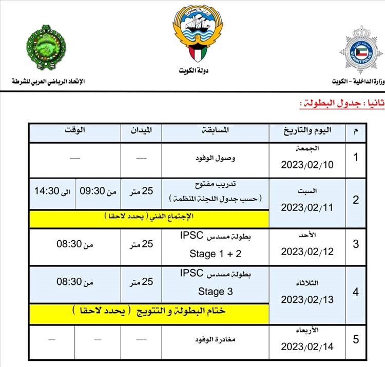 بعد ان قضت بعثة اتحاد الشرطة الرياضي لبلادنا اكثر من اسبوع في العاصمة المصرية القاهرة (ترانزيت)، تتجه في هذه اللحظات فجر اليوم الجمعة إلى دولة الكويت الشقيق للمشاركة في بطولة اتحادات الشرطة الرياضية العربية للرماية بالمسدس IPSC، التي تقام خلال الفترة من 10 إلى 14 فبراير.