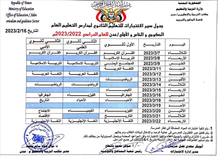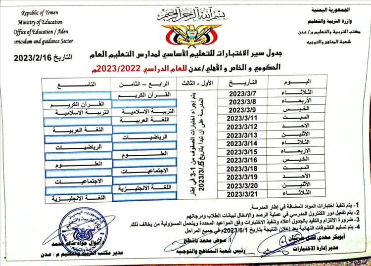 نشر مكتب وزارة التربية والتعليم في العاصمة عدن جدول سير الاختبارات للتعليم الأساسي لمدارس التعليم العام الحكومي والخاص والأهلي للعام الدراسي 2023-2022م.