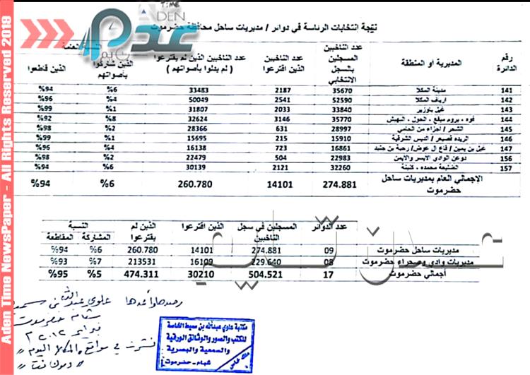 ان 17 دائرة بحضرموت ساحلا وواديا عدد الذين يحق لهم الاقتراع _ التصويت_504,521 الف ناخب الذين اقترعوا بمن فيهم المدنيين والعسكريين30, 210 ثلاثون الف ومائتان وعشره فقط !!! كانت نسبة المشاركة على مستوى حضرموت 5% ونسبة المقاطعة95 % !!